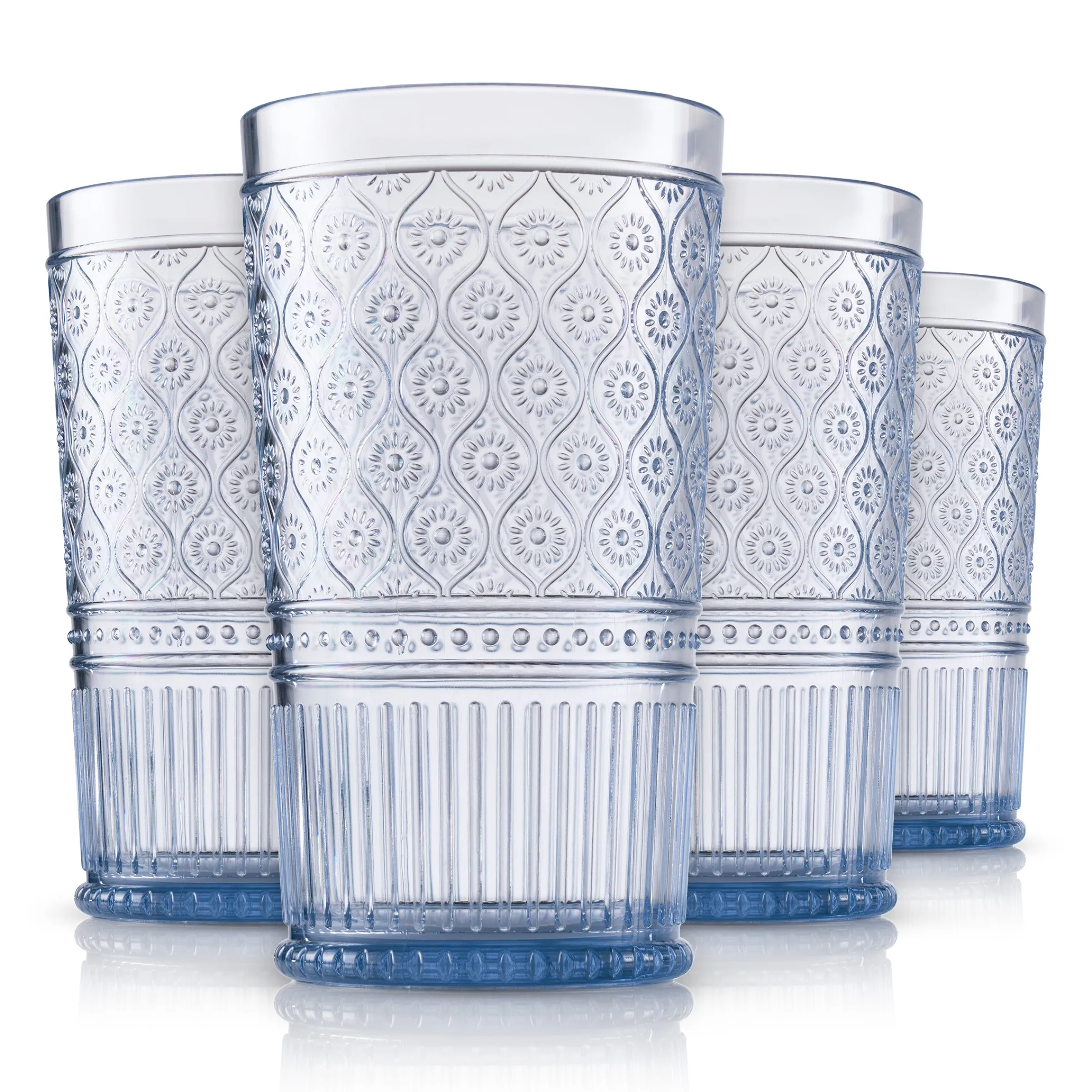The Claro collection features bold colors, embossed texture, and coordinating designs, inspired by the Victorian era. This modern take on embossed glass is perfect for parties, special occasions, and everyday use. With a spring and summer aesthetic, these acrylic glasses are perfect for outdoor gatherings.