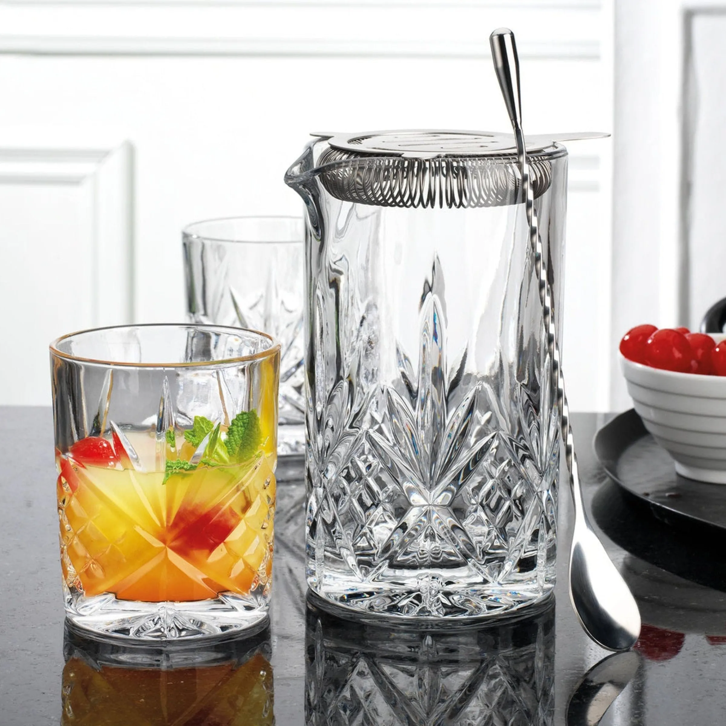 - Elegant 6-piece mixing pitcher set showcasing the timeless beauty of crystal-cut glass.