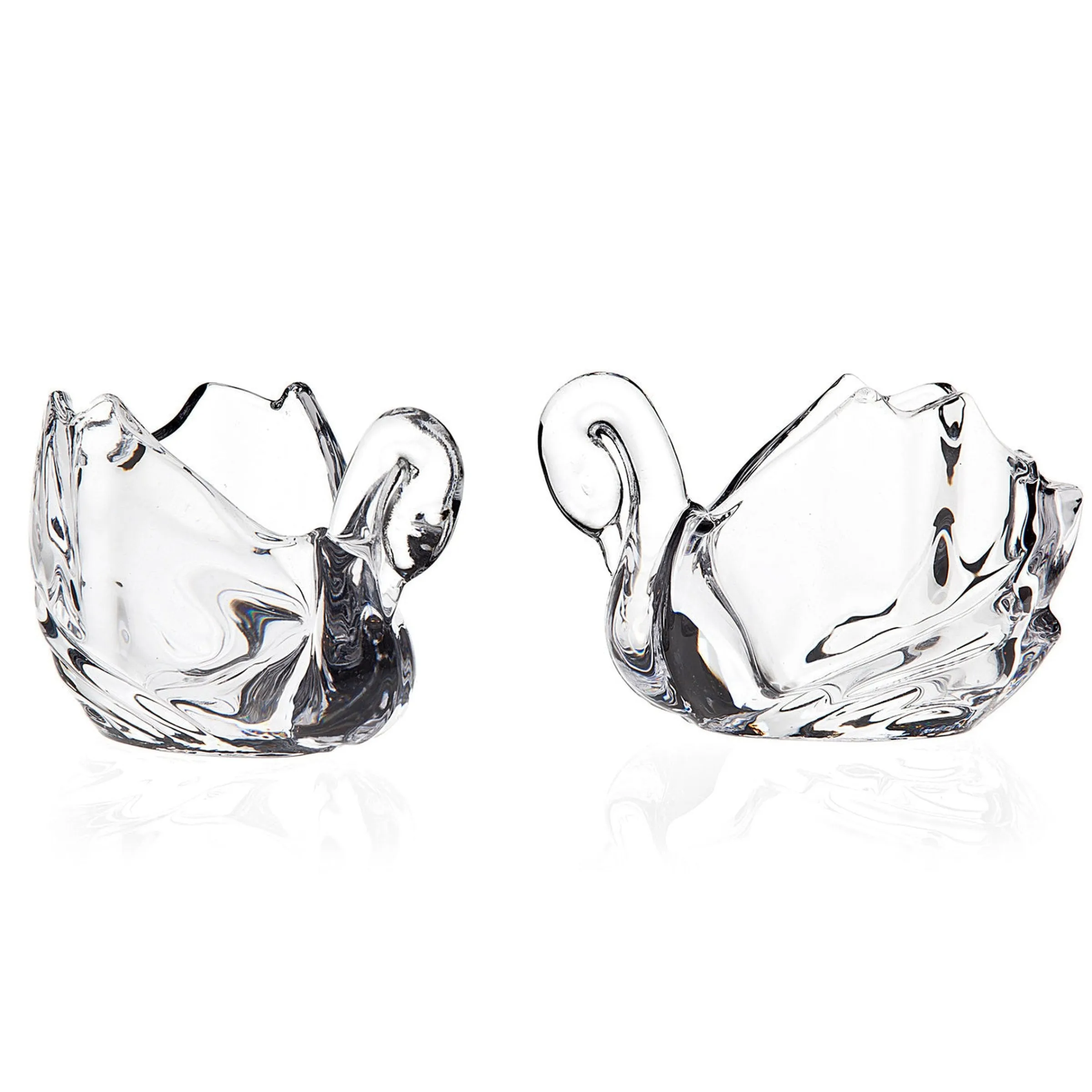 This sophisticated set of crystal swan votive holders exudes an exclusive atmosphere, enhancing any tablescape. The set’s opulent design and timeless aesthetic elevate any interior space, tastefully adding an air of luxurious refinement.