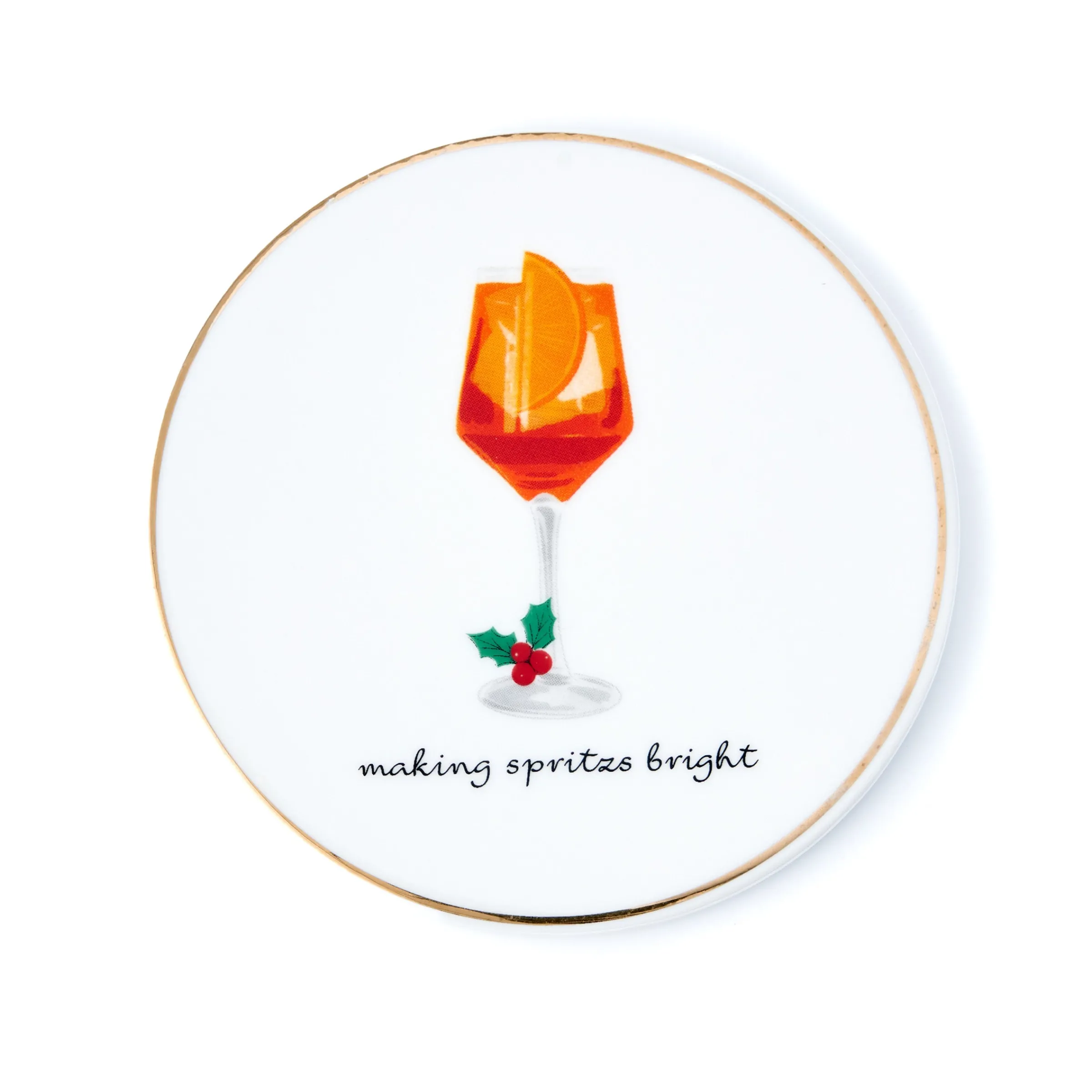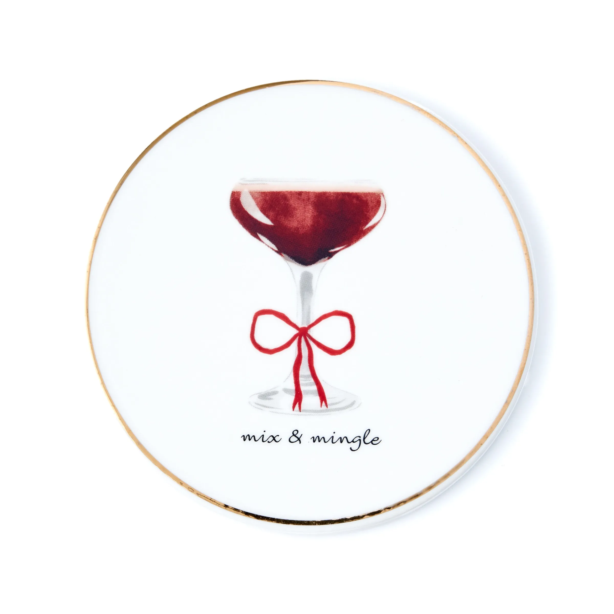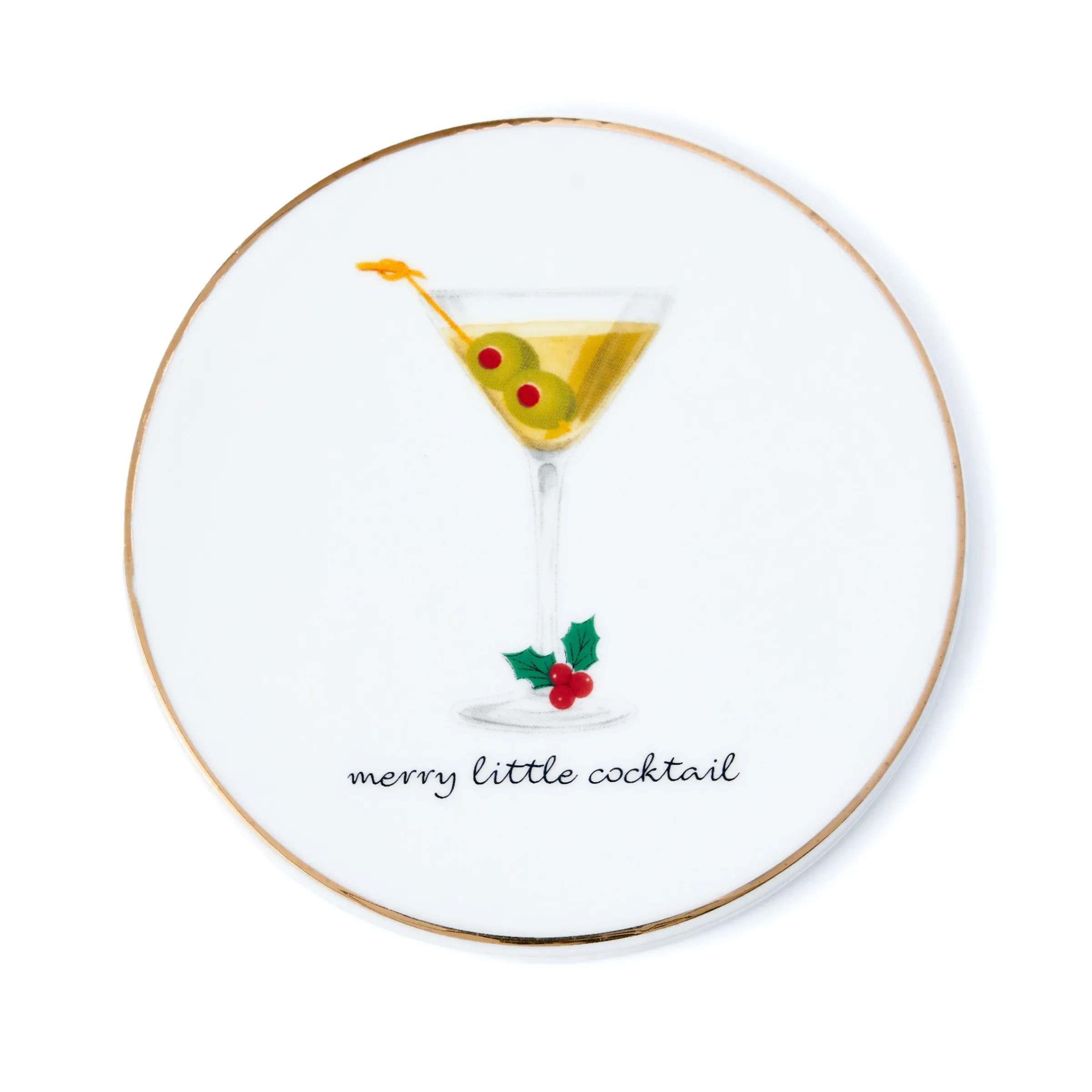 Raise a glass to festive style with the Holiday Cheers Gold Rim Coaster Set. Crafted from fine porcelain and accented with a radiant gold rim, each coaster features charming holiday cocktail illustrations and playful seasonal sayings. Perfect for protecting your tabletops in style, this set pairs beautifully with the coordinating appetizer plates and serving platter for a complete holiday entertaining look. A must-have for parties, gift-giving, or simply adding a cheerful touch to your home this season.