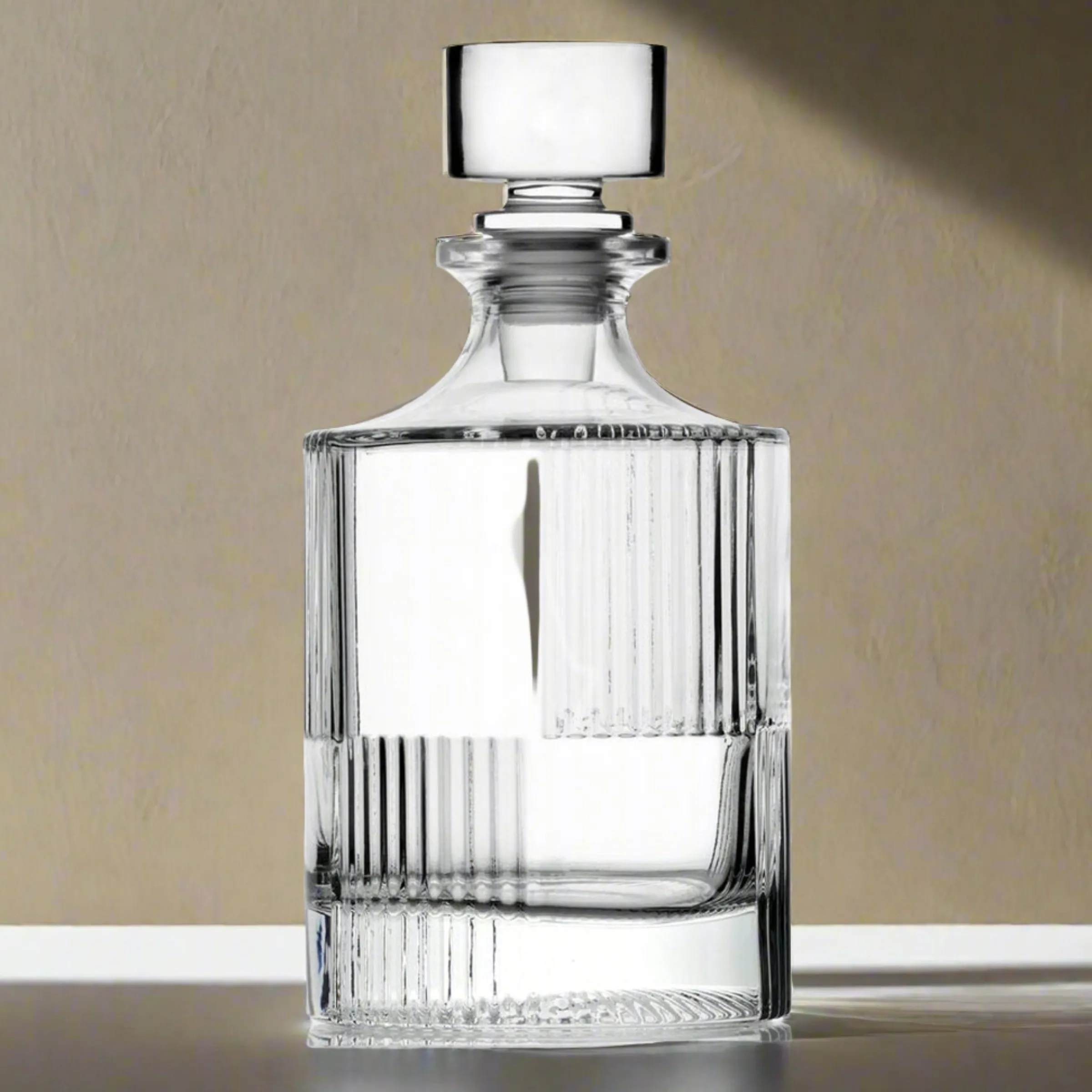 Present your finest whiskey in sophisticated style with the Scatola Whiskey Decanter. Crafted with a round crystal cut design and a unique checkered pattern, this decanter provides a tasteful elegance that lends to the perfect pour of your favorite spirits—a toast to premium taste with this luxurious decanter.