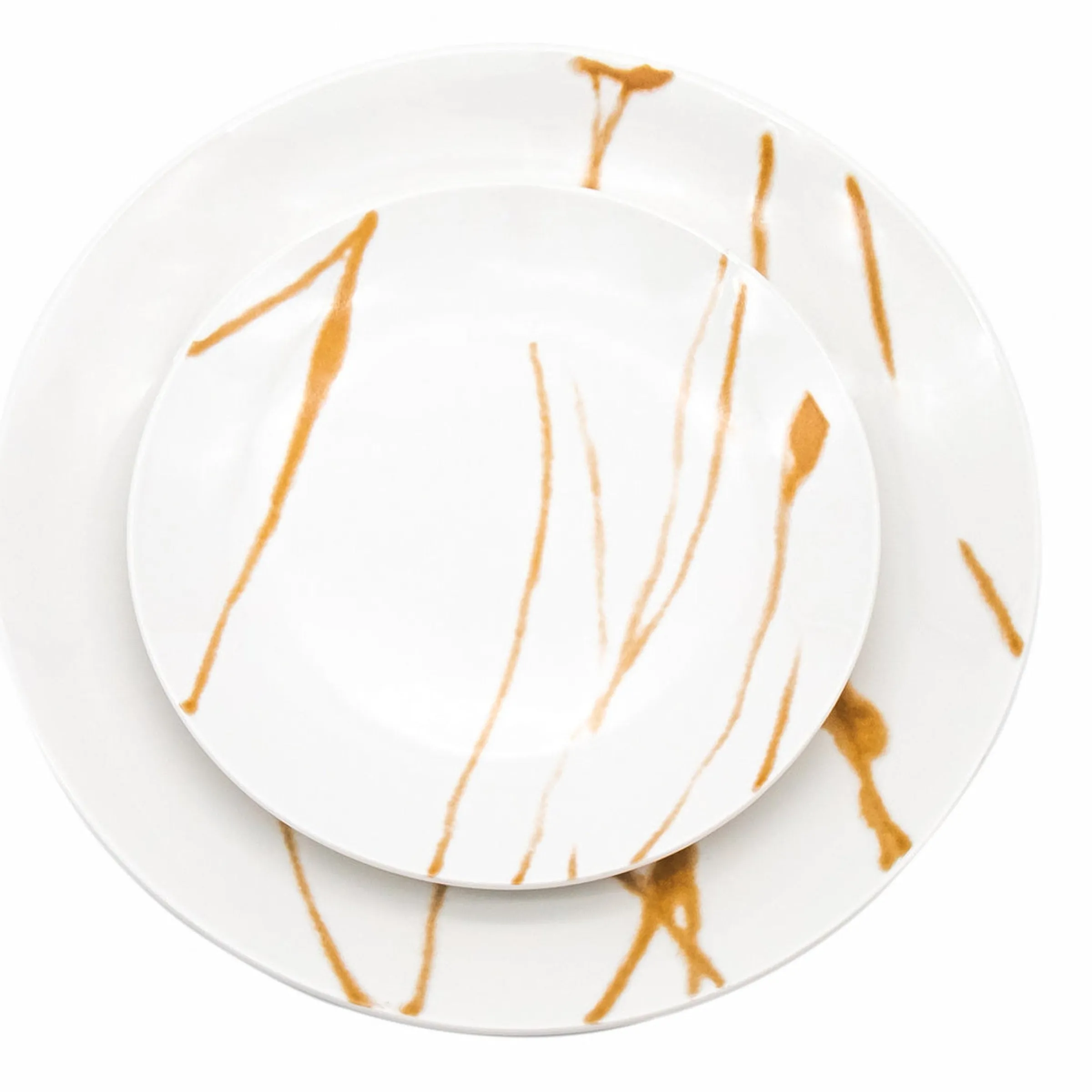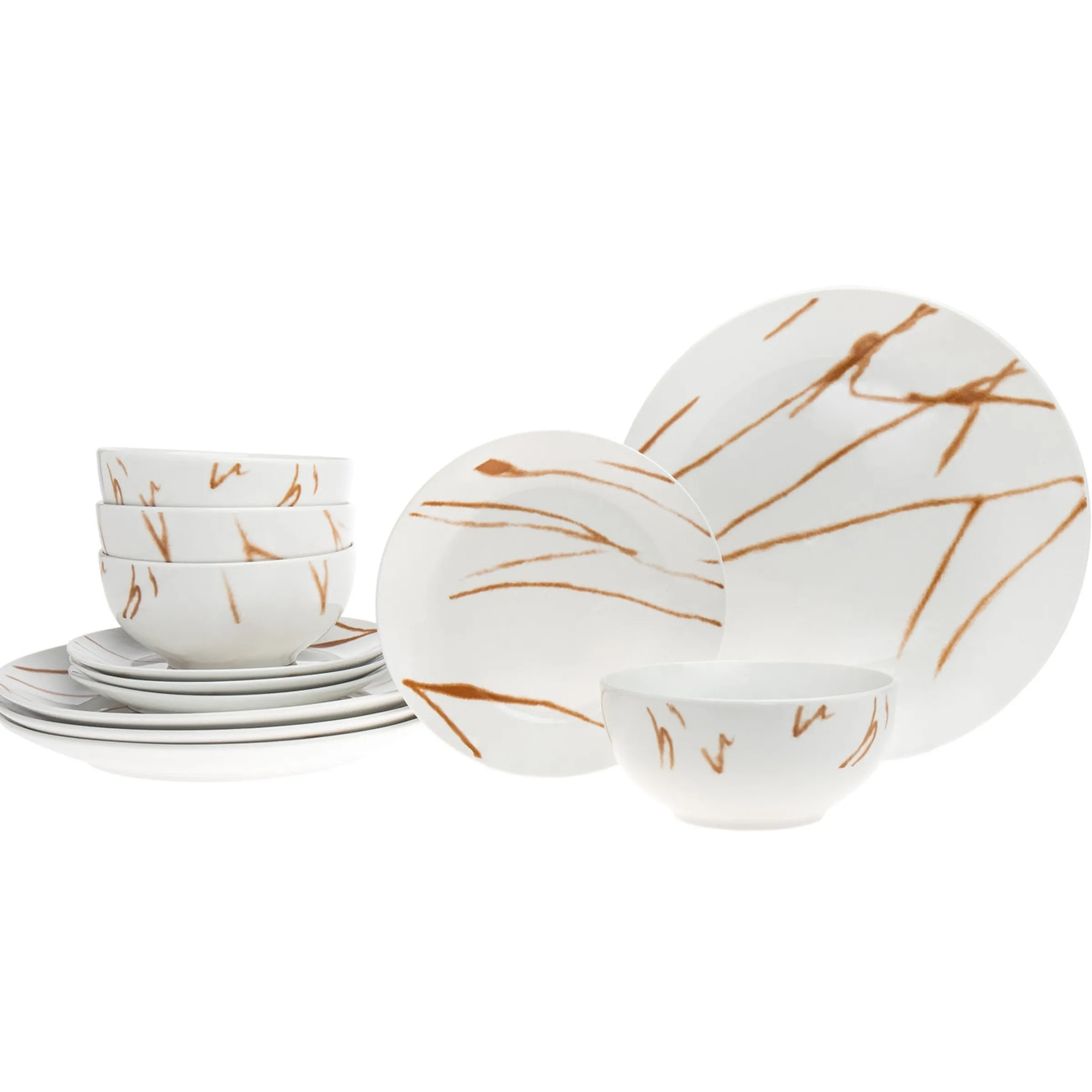 This luxurious Boulon Gold Porcelain 12 Piece Dinnerware Set satisfies both style and performance. Crafted with porcelain and featuring an exquisite gold streak marble design, this sophisticated set includes service for four and provides an elegant touch to your dinner table.