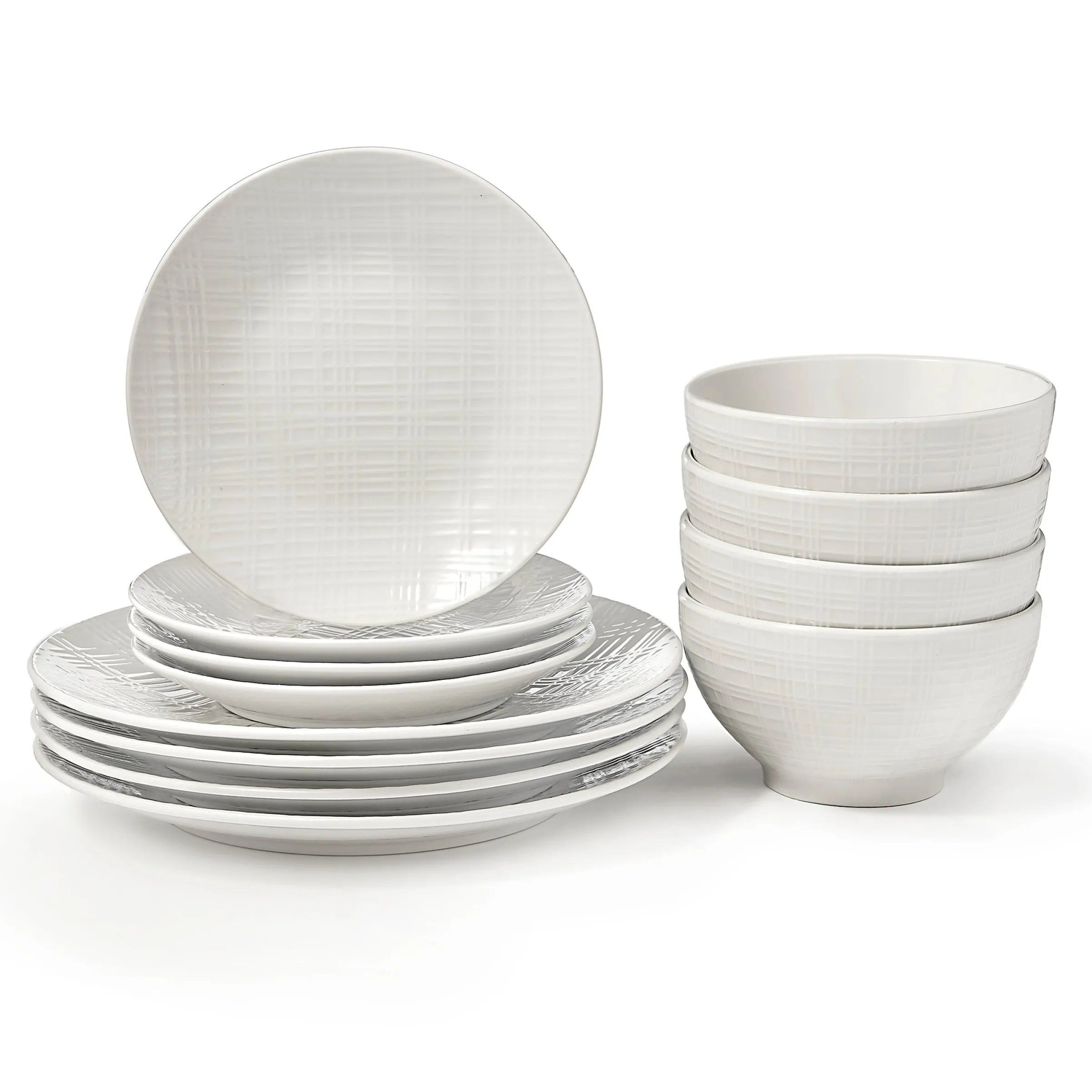 An exquisite crisscross of white on white brings an elegant, alluring pattern to this porcelain dinnerware set, making it a striking addition to any table. The perfect combination of modern and classic design, this dinnerware set will bring a touch of sophistication and glamour to your next gathering.