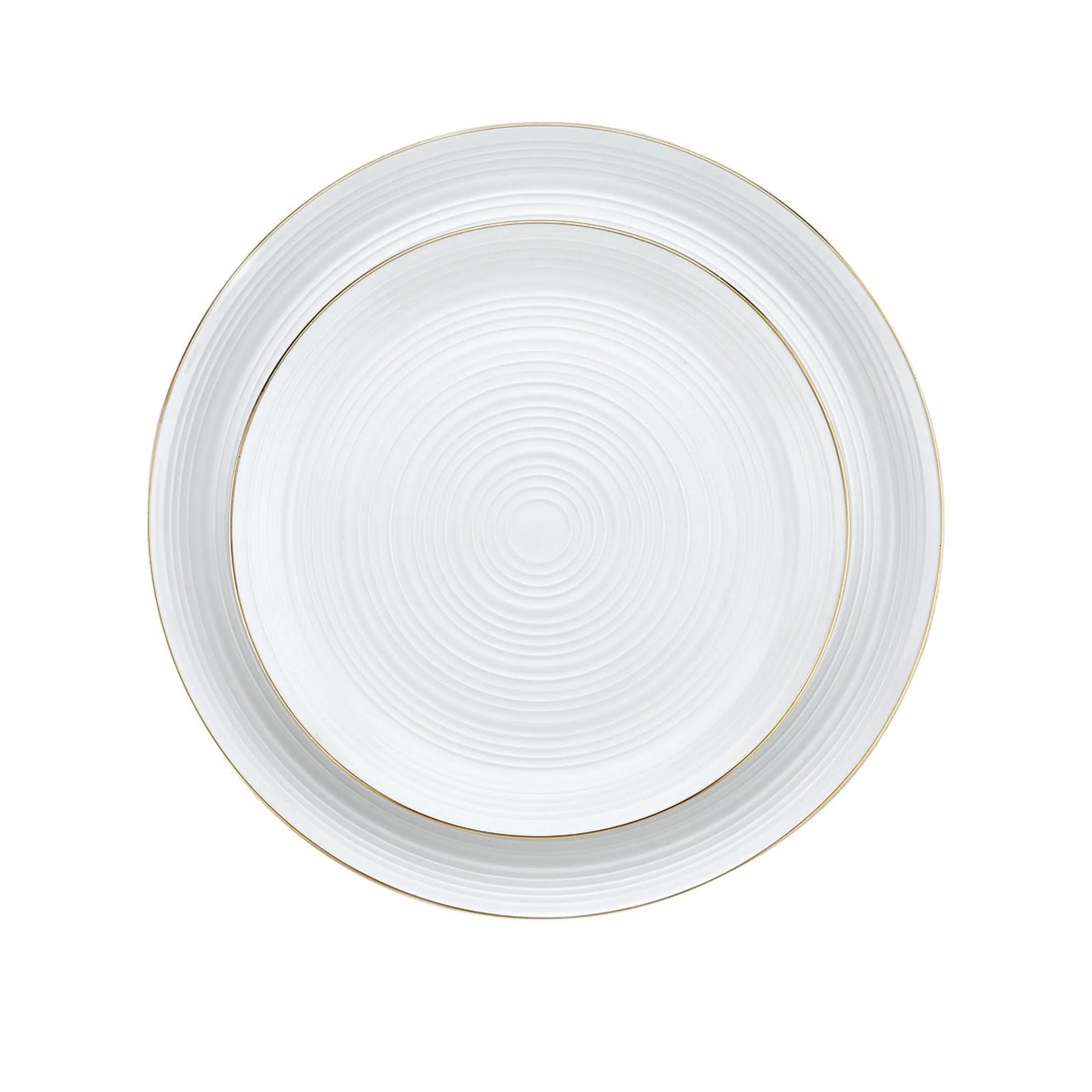 This Linear Porcelain Gold Rim 12 Piece Dinnerware Set is an exquisite showpiece for any tabletop. Crafted from high-quality porcelain with a striking ripple design, this service for four includes four dinner plates, four salad plates, and four bowls, each featuring a timeless gold rim. Enjoy a classic meal with this elegant set.
