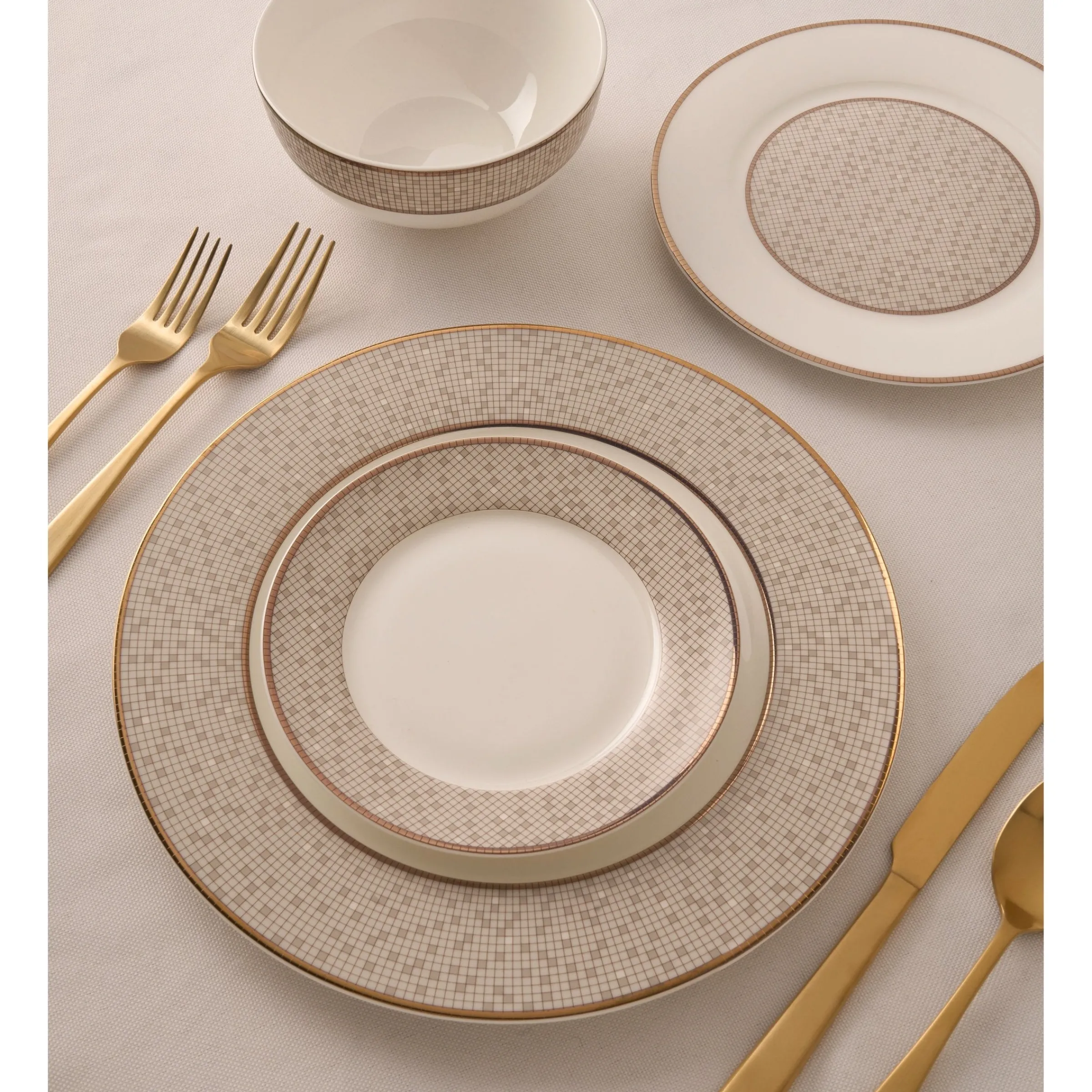 Endowed with antiquated golden bands and distinctively designed with a mosaic tile pattern, the dinnerware set promises opulence. A timeless blend of luxury and sophistication, this dinnerware set is the perfect way to bring a hint of magnificence into your dining experience.