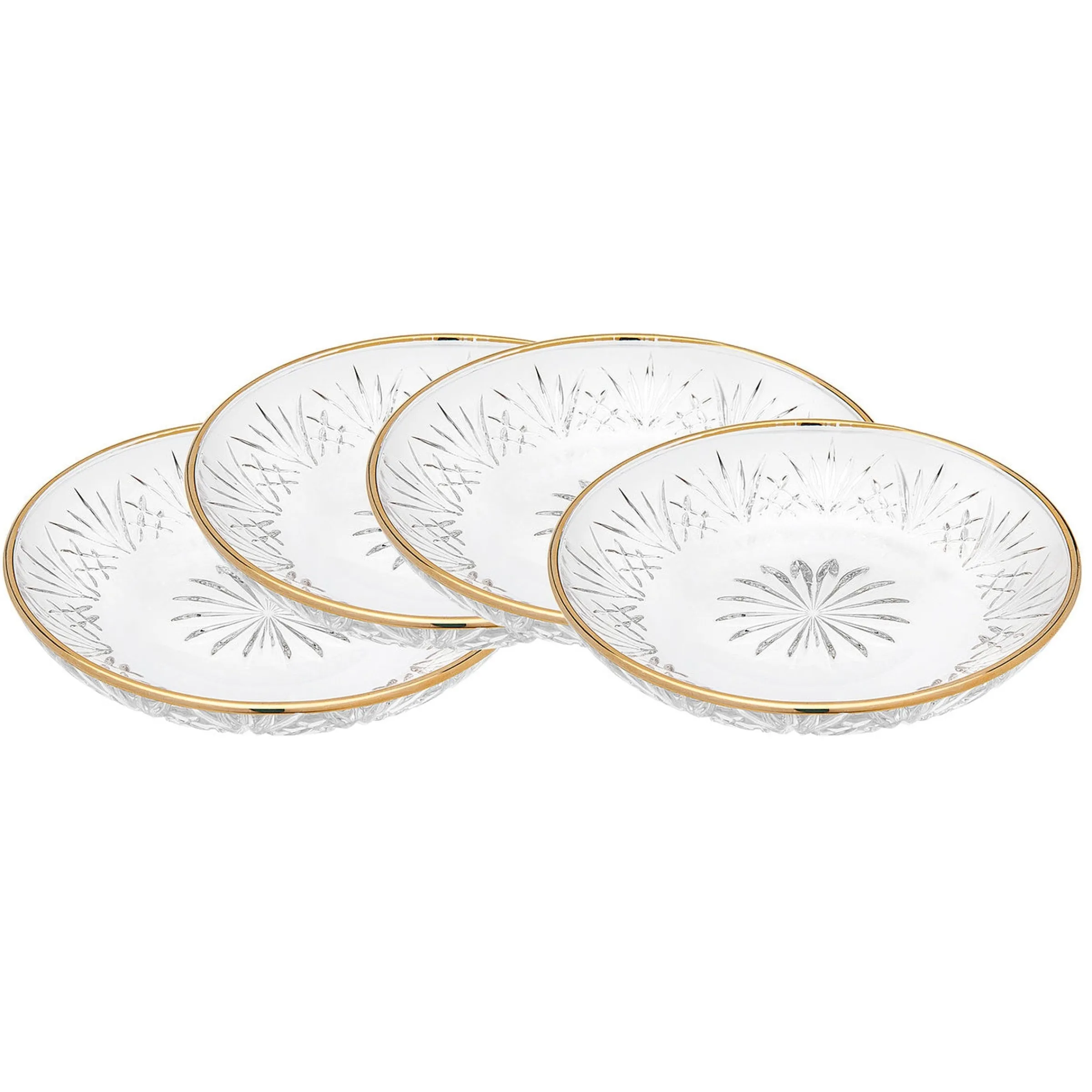 Experience the exquisite beauty of our Dublin Crystal collection, a tribute to the timeless artistry of crystal cutting. These gold-rimmed dessert plates combine sparkling brilliance with graceful design, elevating every table setting. Whether hosting a formal dinner or enjoying a sweet treat at home, this refined set brings elegance and warmth to any occasion. Make every dessert a statement with these classic, yet captivating, pieces.