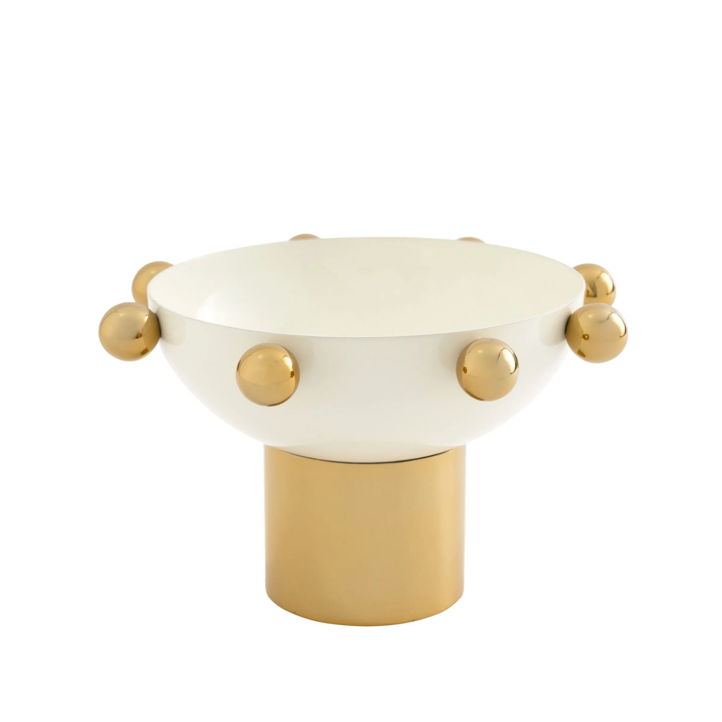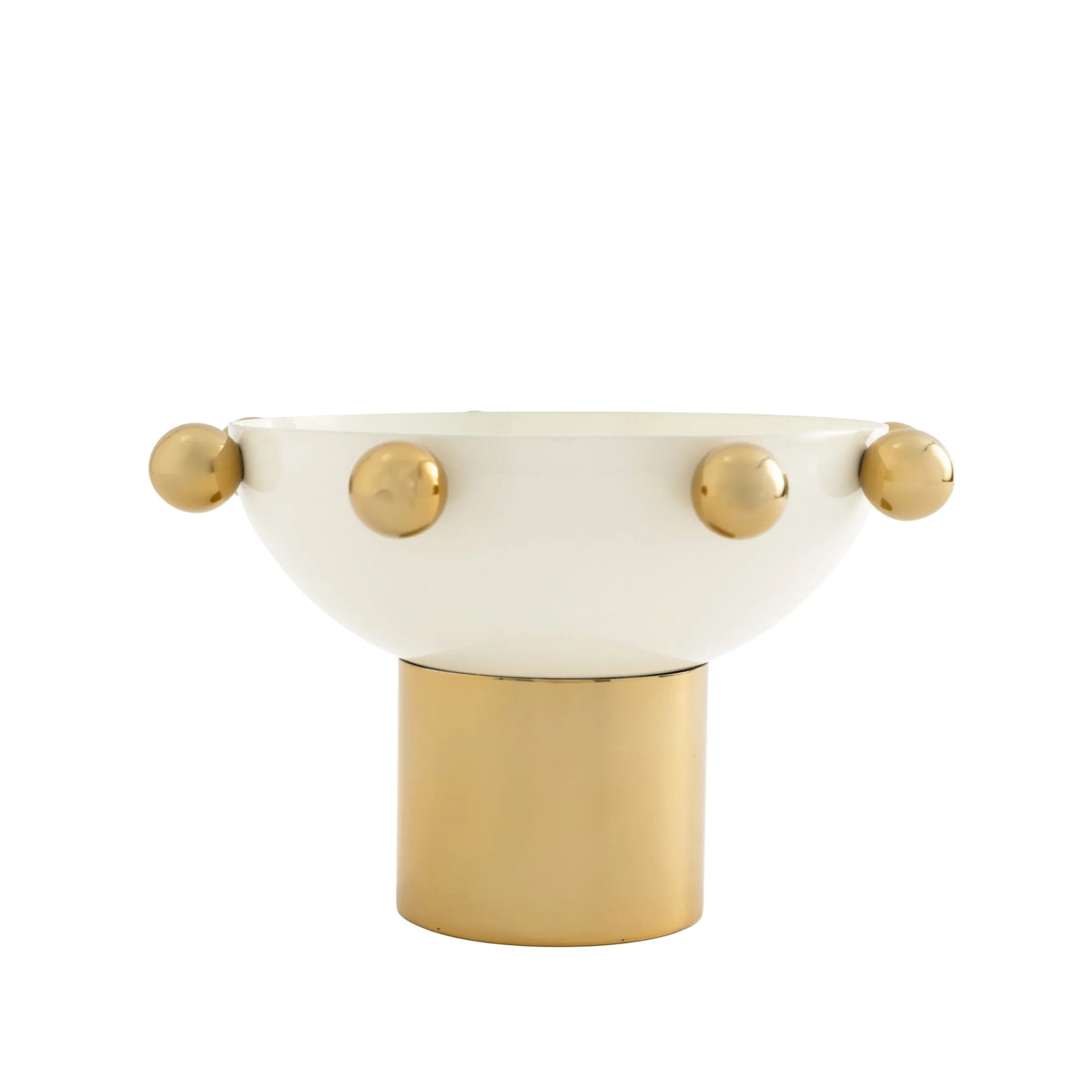 Add a modern touch of elegance to your table with the Temari White & Gold Footed Nut Bowl. Handmade in India, this bowl is crafted from polished stainless steel with a sleek white surface and clean, contemporary lines. Elevated by the collection’s signature gold ball feet, it blends modern design with timeless artistry. Perfect for serving nuts, candies, or small snacks, it also doubles as a refined decorative accent. Versatile and sophisticated, this piece makes everyday entertaining feel special.