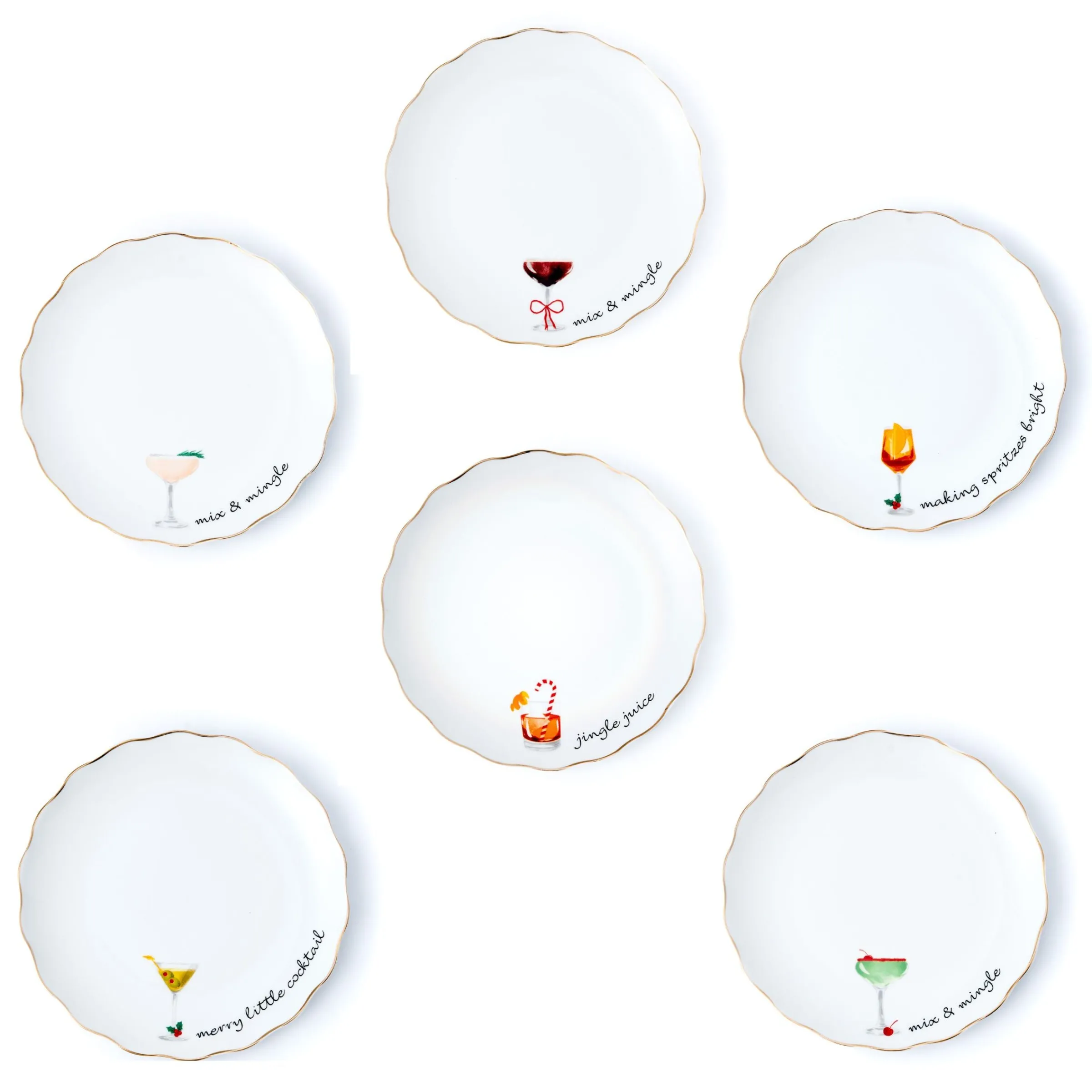 Bring festive spirit to every gathering with the Holiday Cheers Appetizer Plate Set. Crafted from fine porcelain and accented with a shimmering gold rim, each plate showcases playful holiday cocktail designs and cheerful sayings. Perfectly sized for hors d’oeuvres, desserts, or small bites, this set of six adds elegance and joy to your holiday entertaining. Pair with the matching coasters and serving platter for a coordinated seasonal table.