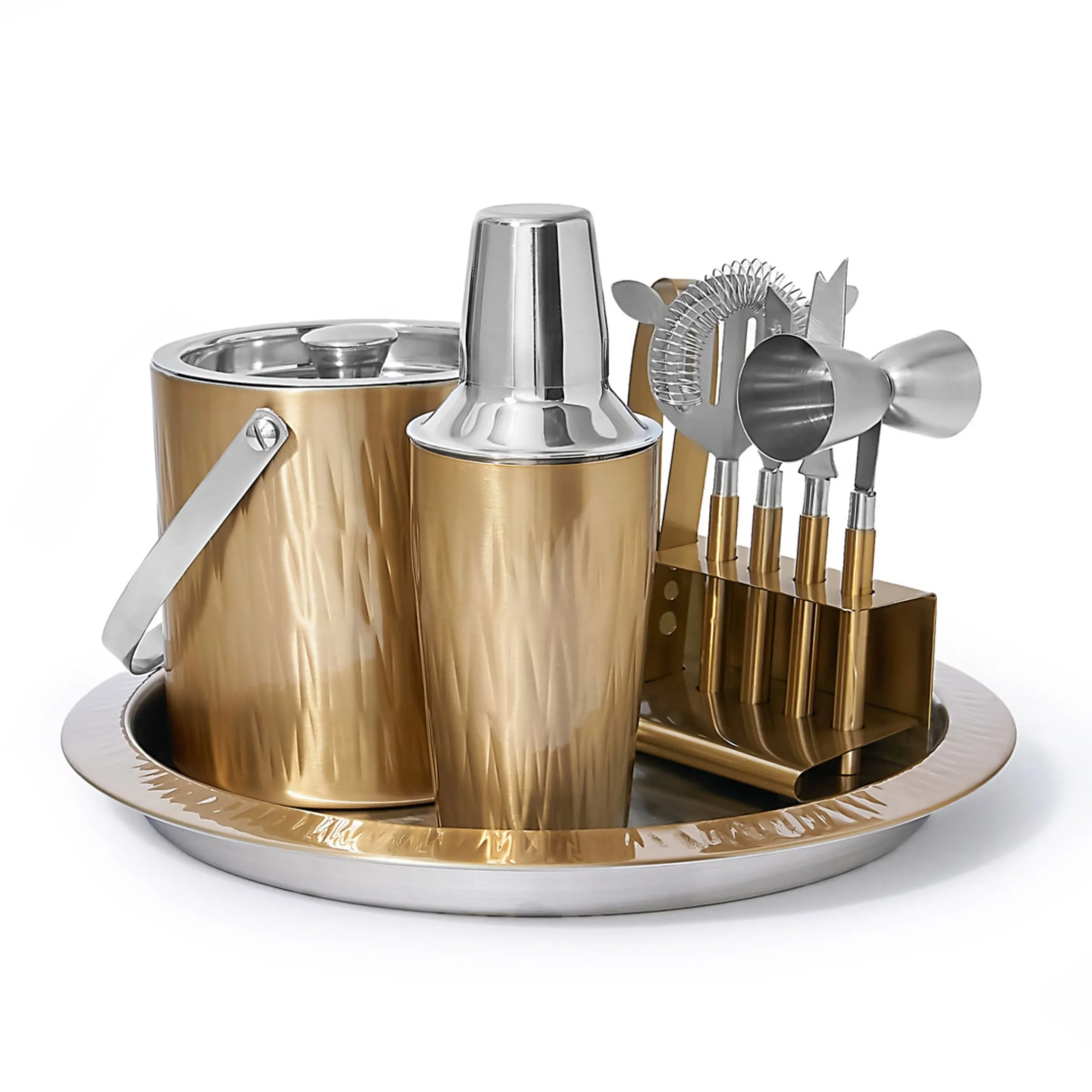 This Aztec Gold 9 Piece Bar Tool Set creates a classic and stylish look while providing all the necessities for a perfect bar setup. Constructed with fine craftsmanship and materials, this handmade gold textured set will give your bar a beautiful, timeless appearance. Ideal for any home bartender.