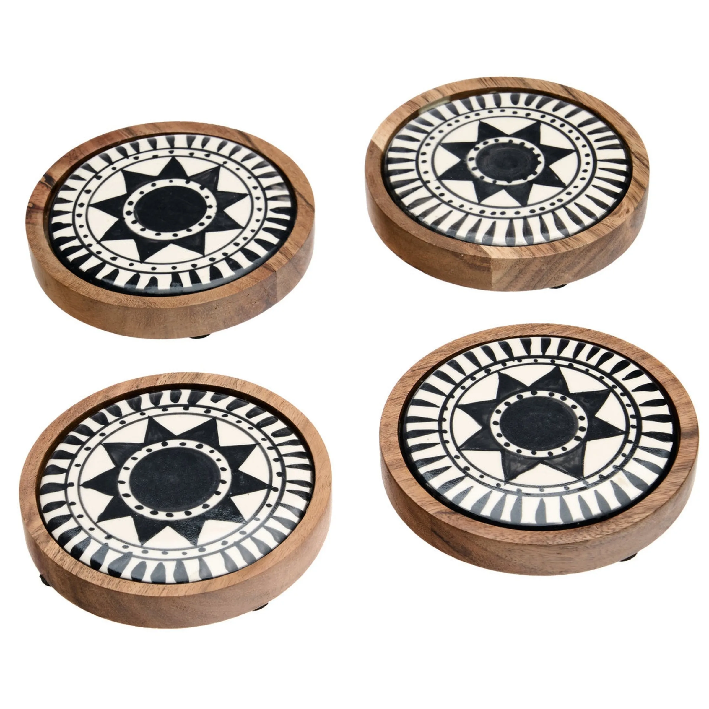The sleek black and white printed design contrasts beautifully with the sturdy wood base, ensuring your cup rests securely and steadily.