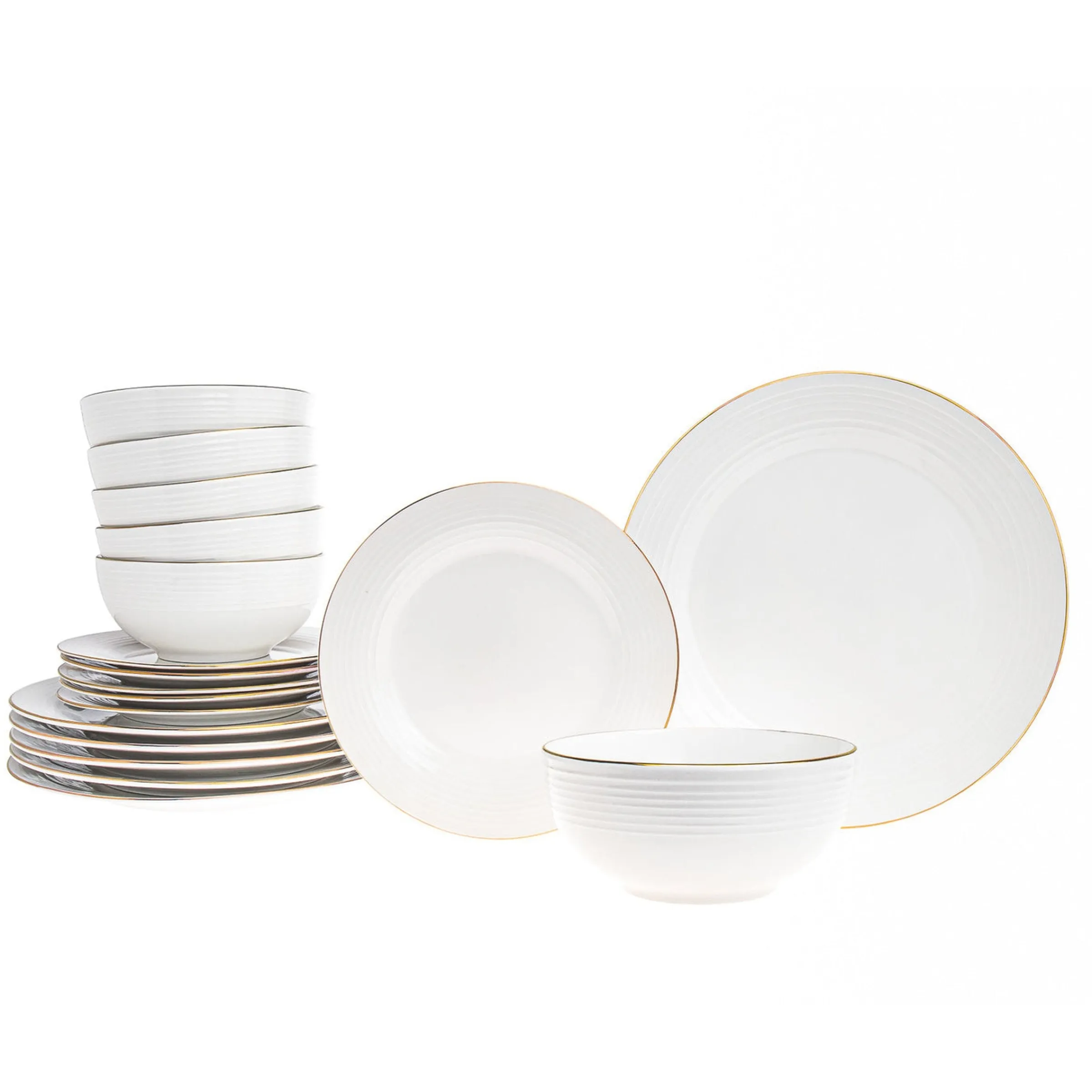A slim gold band adds understated elegance to this set. With a classic, contemporary look, durability, and versatility, this gold-rimmed dinnerware has a simple, clean look with a sophisticated glimmer. This dinnerware is designed for long-term use and is perfect for anything from casual barbecues to elegant dinner parties. The high-quality, chip-resistant porcelain makes it easy to clean and maintain.