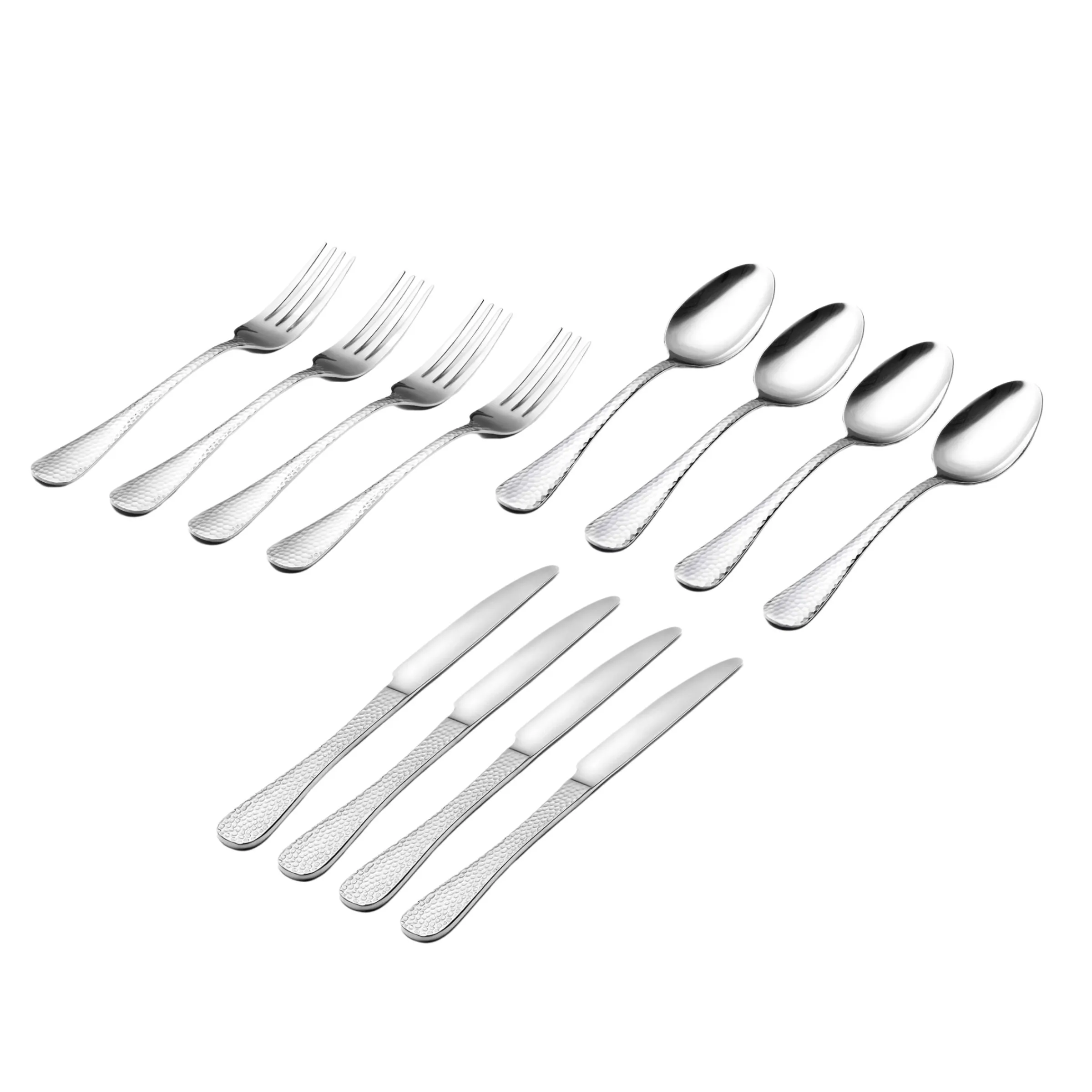 Classic hammered finish and a clean, versatile design that fits well with any decor. Its stainless-steel core makes it sturdy enough for everyday use, and each place setting ensures that you have all the right utensils, whatever the occasion.