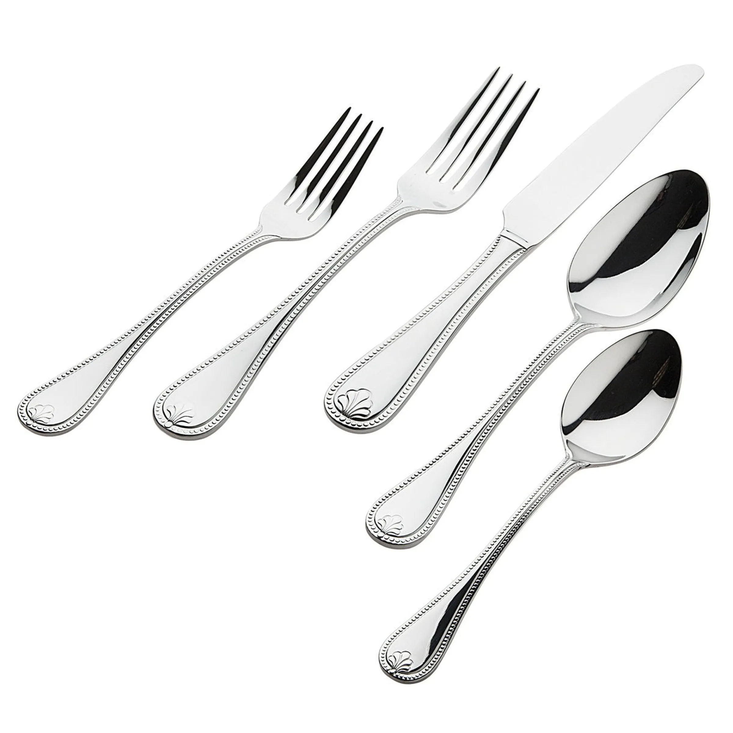 This Venetzia Mirrored 18/0 Stainless Steel 20 Piece Flatware Set will add a visually appealing touch to your table. Its beaded edge and shell design on the handle creates a unique look that will stand out among your flatware. This high-grade stainless steel is durable and perfect for everyday use while providing an elegant touch to any tabletop.