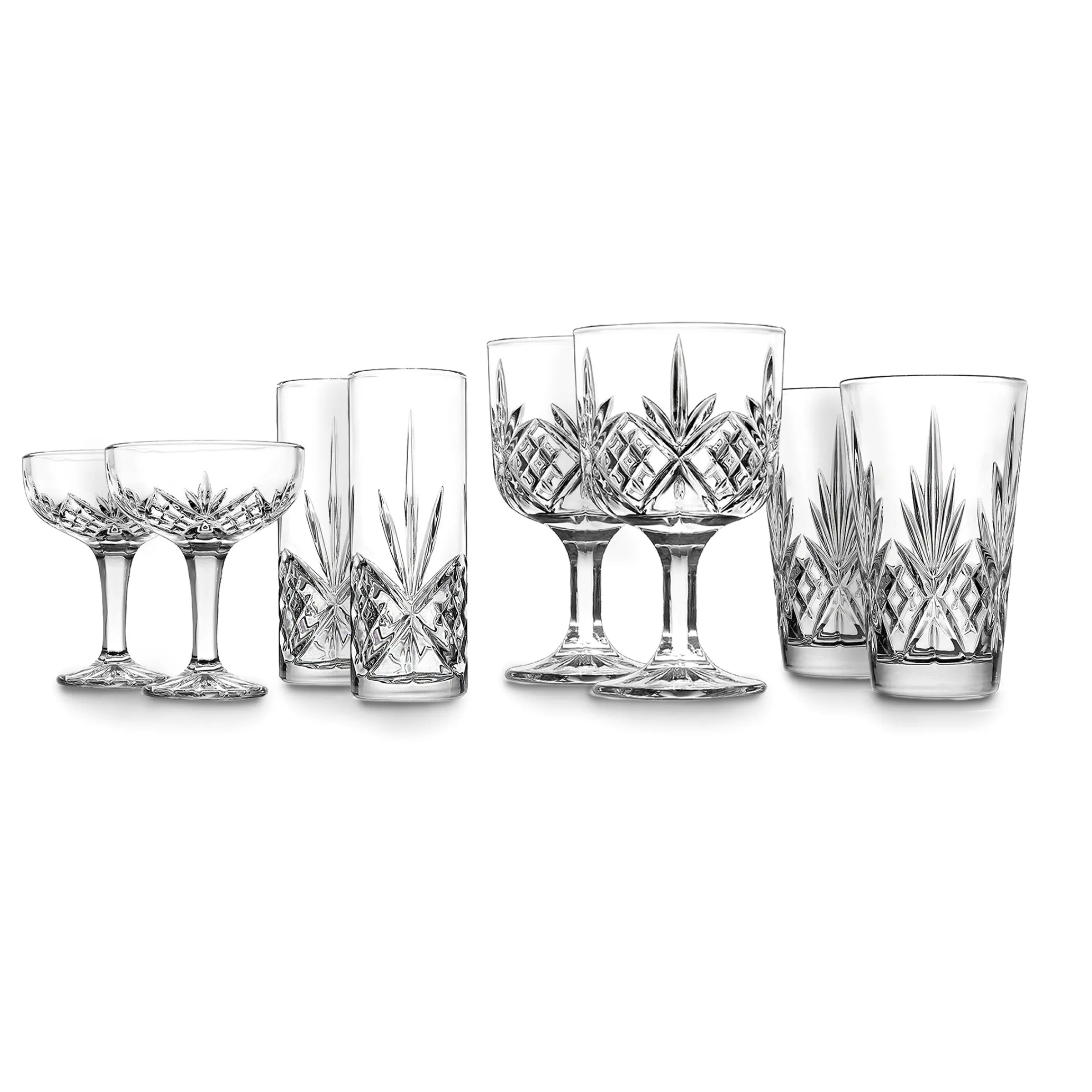 - Includes 2 Gin Balloon Glasses, 2 All-Purpose Tumblers, 2 Tom Collins Glasses, and 2 Champagne Coupes.